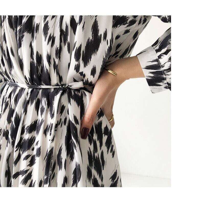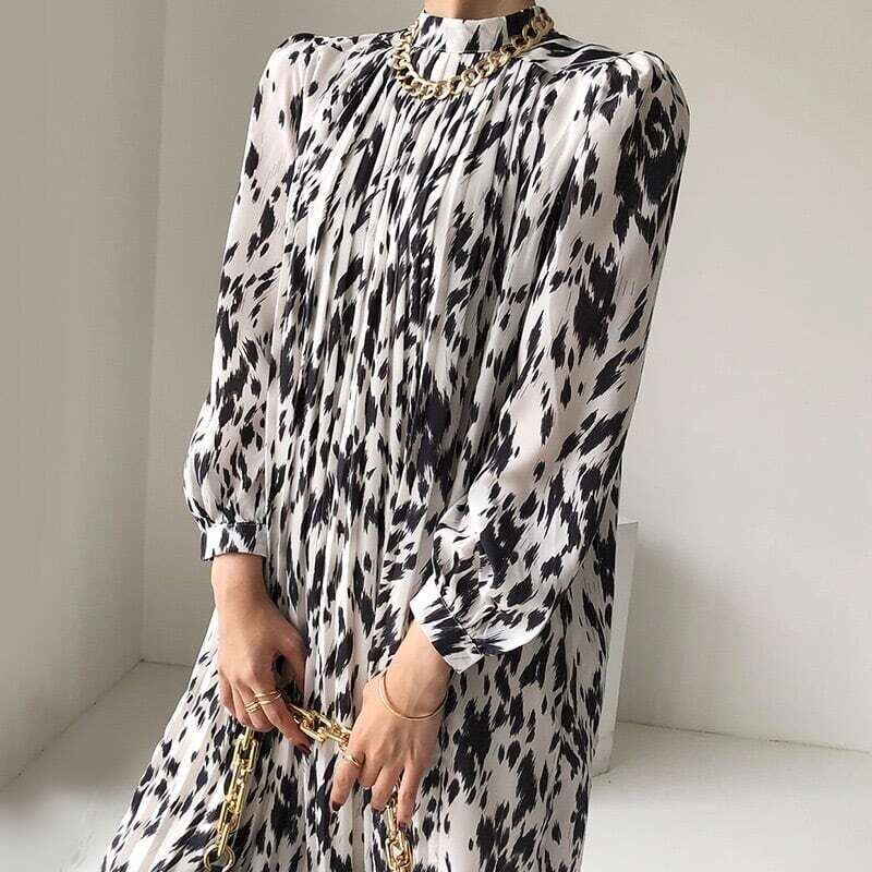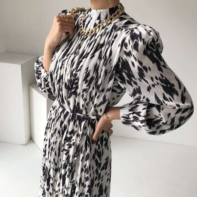 プリーツワンピース アニマル柄ワンピ ウエストリボン エレガント E541