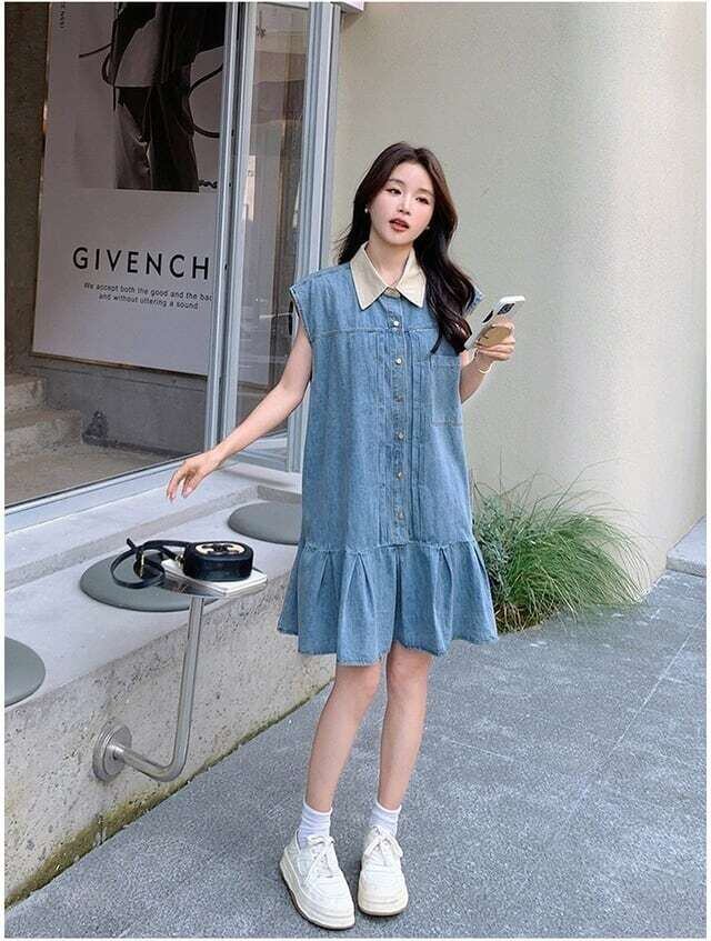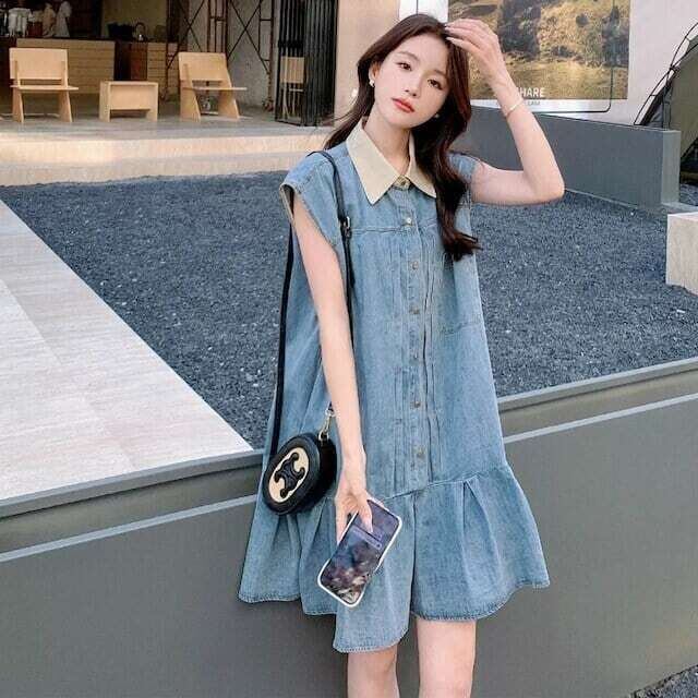 デニムワンピース ポロワンピ フリルスカート ガーリー E376