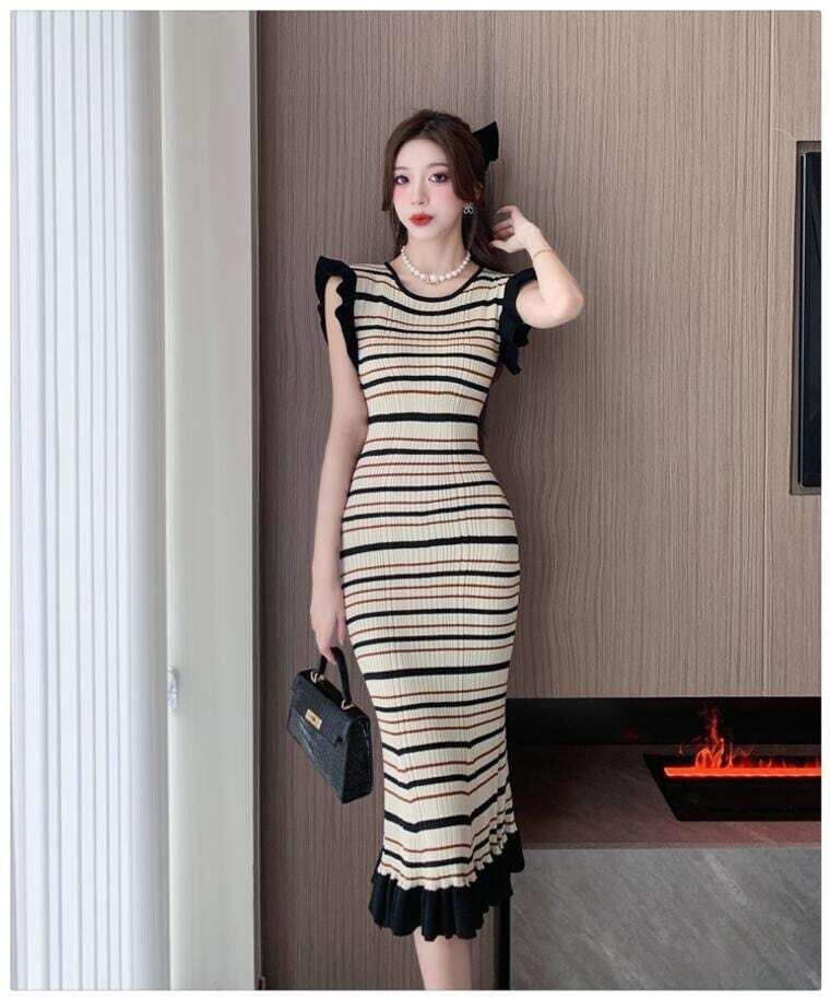 ボーダーワンピース フリルワンピ デート フェミニン E300