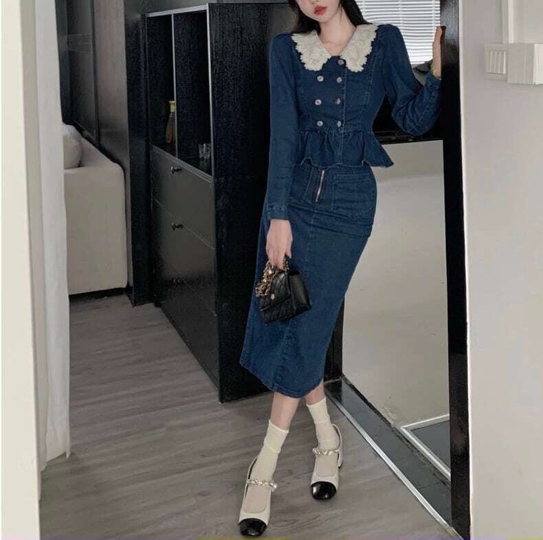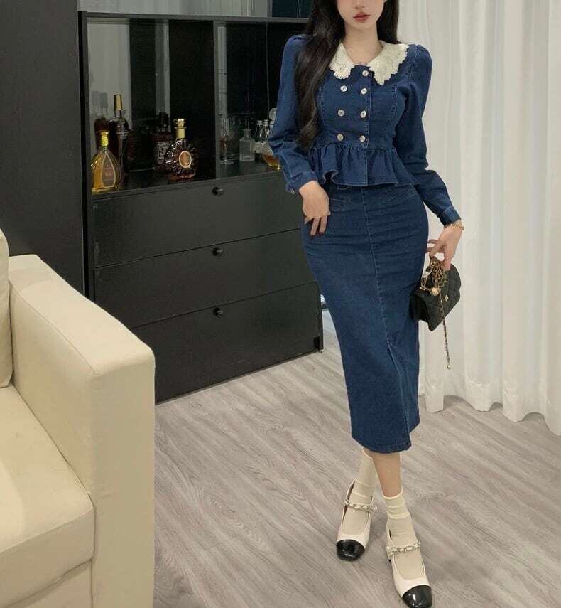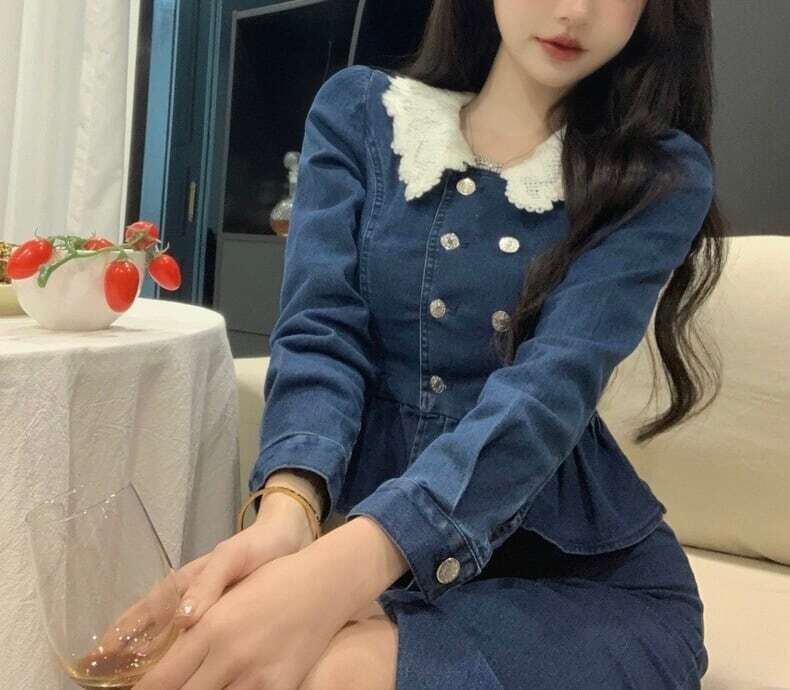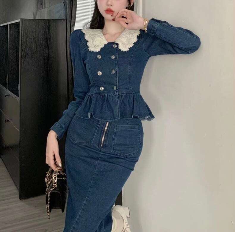 デニムセットアップ 襟付き セットアップ ペプラム ガーリー デート E114