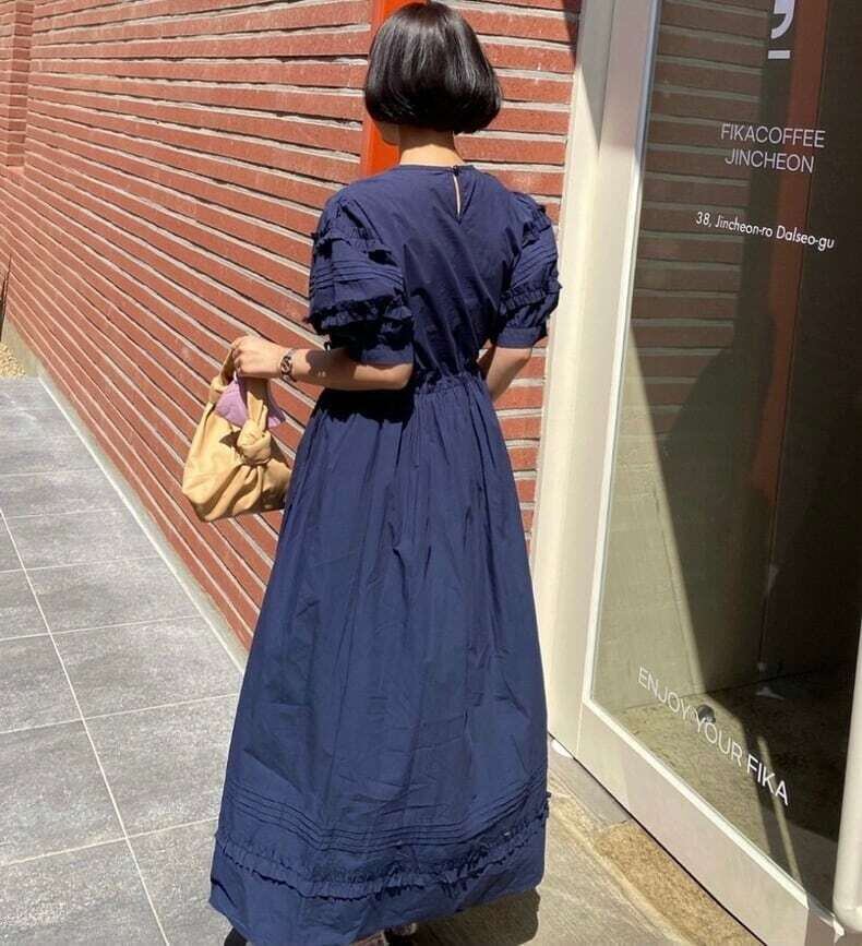 パフスリーブワンピース フリル ラウンドネック ガーリー 通学 ママコーデ E230