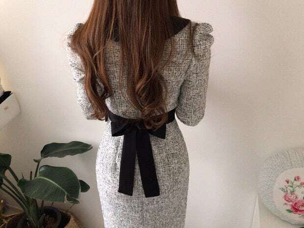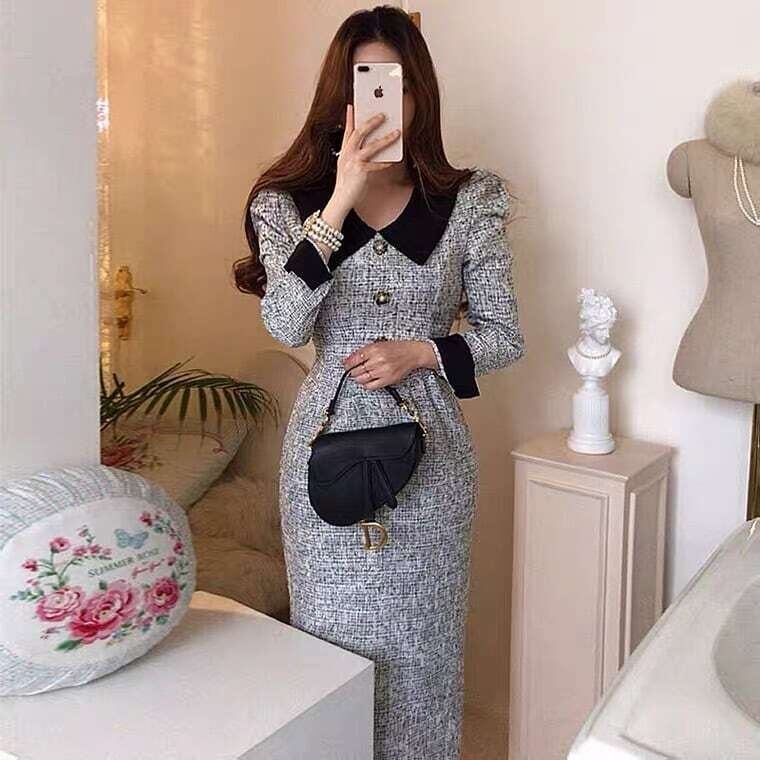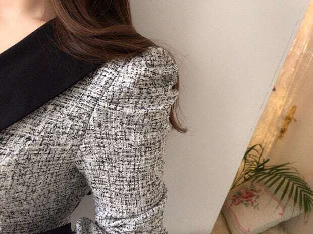 ツイードワンピース パフスリーブワンピース オフィスカジュアル お呼ばれ エレガント E193