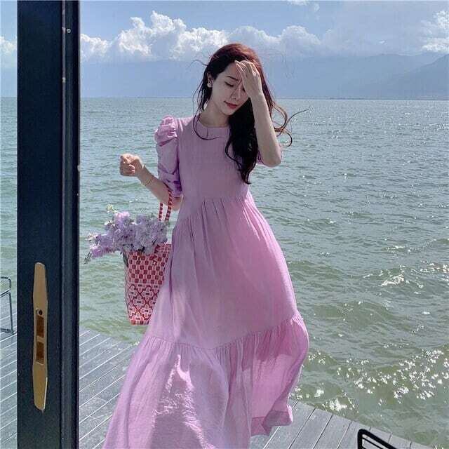 シフォンワンピース パフスリーブワンピース バックリボン フェミニン リゾート E192