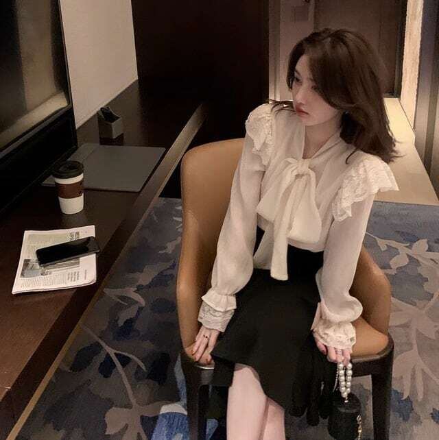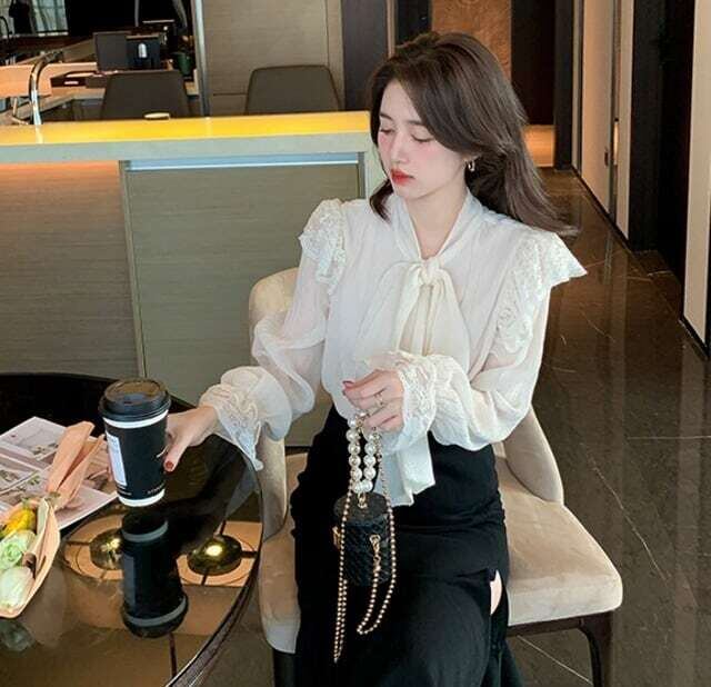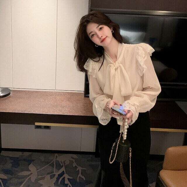 シフォンブラウス リボンブラウス ラッパ袖 レース ガーリー デート E165
