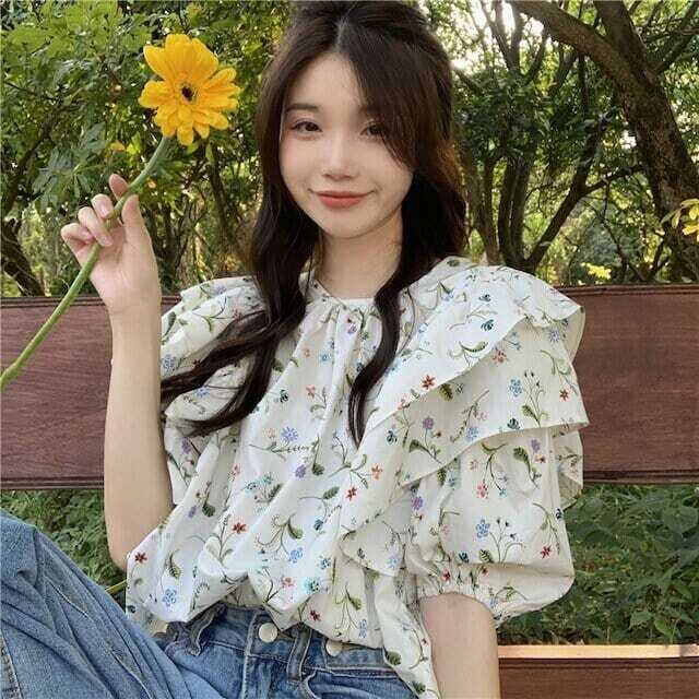 花柄ブラウス パフスリーブブラウス 花柄トップス ガーリー カジュアル 通学 E204