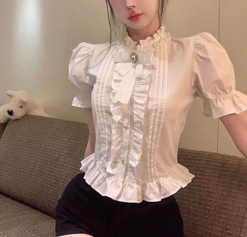 フリルブラウス リボンモチーフブラウス レースシャツ ショート丈 ガーリー ドーリー E232