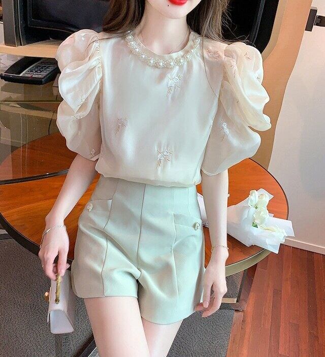 パフスリーブトップス パール フリル フェミニン ブラウス E368
