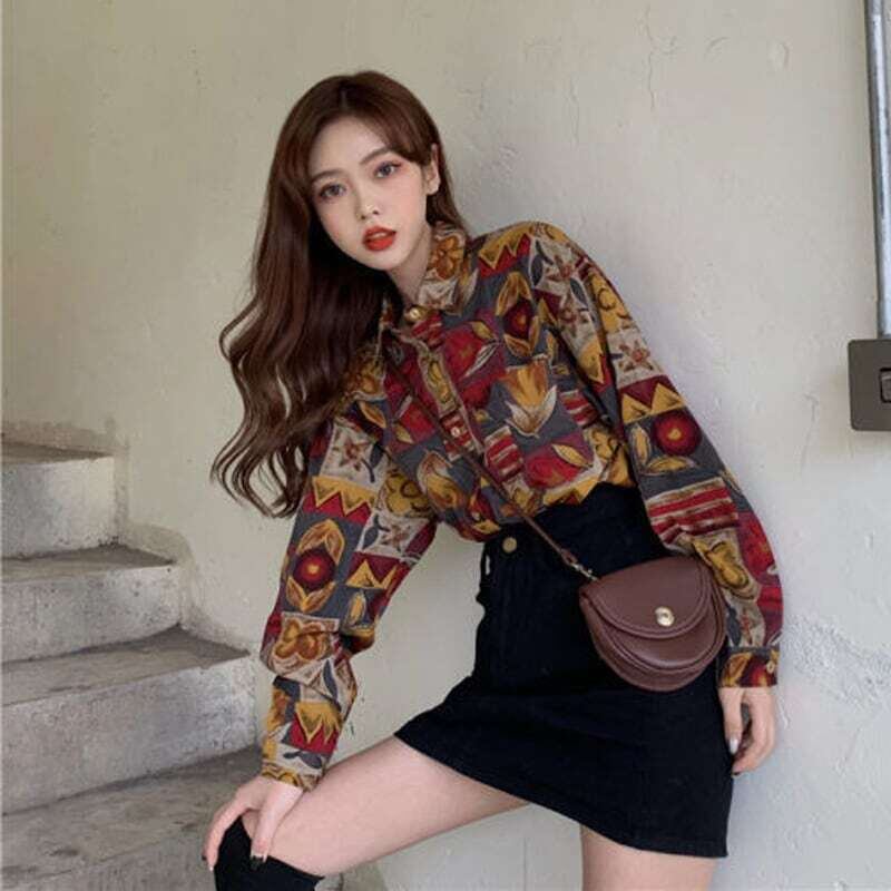 レトロ柄シャツ ブラウス プリントシャツ カジュアル E446