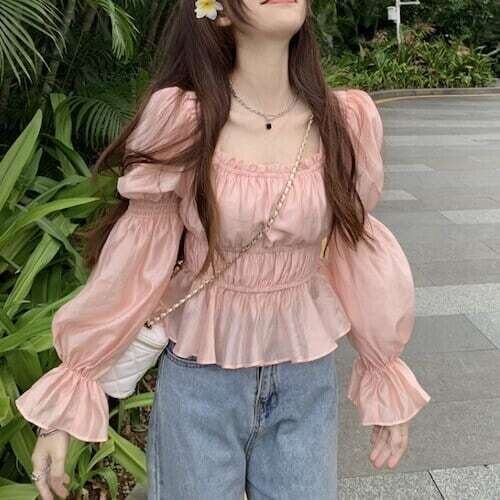 パフスリーブトップス ペプラムトップス スクエアネック ガーリー リゾート E213