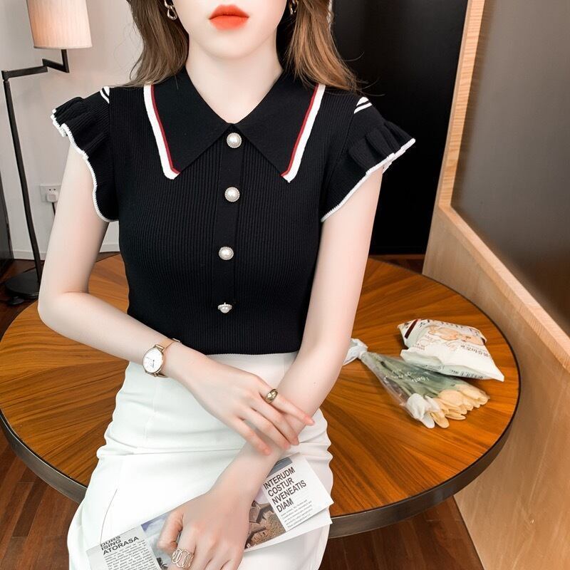 サマーニットトップス ポロシャツ ガーリー フリル E266